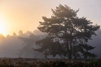 landschap op de Ginkel in Ede, Gelderland, waar de zon opkomt over de heide, waar de bomen in de ochtendnevel staan