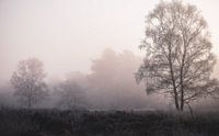 landschap op de Wolfhezerheide in Doorwerth, waar de bomen op een koude winterochtend in de nevel staan
