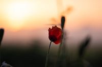 close up van een enkele klaproos, met op de achtergrond de opkomende zon die door de ochtendmist schijnt