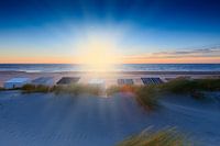 sfeervolle zonsondergang in de Noordzee bij de duinen van 's-Gravenzande met enkele houten strandhuisjes in de voorgrond; 's-Gravenzande, Nederland