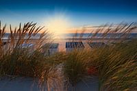 sfeervolle zonsondergang in de Noordzee bij de duinen van 's-Gravenzande met enkele houten strandhuisjes in de voorgrond; 's-Gravenzande, Nederland