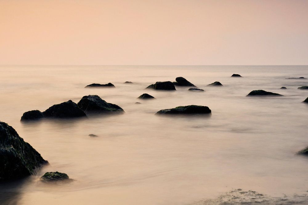 sfeervolle zonsondergang langs de Noordzee met de rotsen van een golfbreker in de voorgrond; Den Haag, Nederland