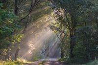 wandelpad op de Ginkel in Ede, Gelderland, waar de ochtendzon door de bomen schijnt en prachtige zonneharpen verschijnen
