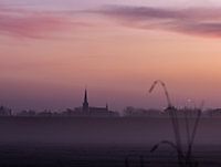 zicht op het kerkje van Heteren, over het mistige landschap, met de roze lucht van de opkomende zon