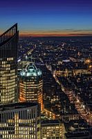 skyline van Den Haag bij avond met de moderne ministeries, gezien vanaf New Babylon; Den Haag, Nederland