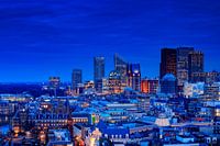skyline van Den Haag kort na zonsondergang met onder andere de moderne ministeries en het Binnenhof