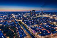 skyline van Den Haag kort na zonsondergang met onder andere het Ministerie van Veiligheid en Justitie, het Ministerie van Binnenlandse Zaken en Koninkrijksrelaties, het Ministerie van Volkshuisvesting, Ruimtelijke Ordening en Milieu, het Haagse stadhuis, winkelcentrum en appartementencomplex New Babylon en Den Haag Centraal Station