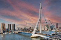 skyline van Rotterdam met de erasmusbrug over de rivier de maas met avondrode lucht