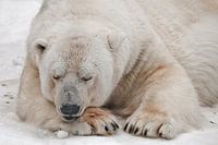 slaapt met zijn ogen dicht en laat zijn hoofd op zijn poot rusten. Krachtige roofdier-ijsbeer ligt in de sneeuw, close-up