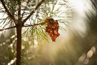 In het bos tijdens de net ontwakende zon, op een klein gevallen blad...