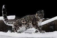 Grote roofkat - de sneeuwluipaard springt behendig en rent door de sneeuw tegen een donkere achtergrond, sterk en snel zeldzaam dier.