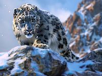 Het sneeuwluipaard, een majestueus roofdier uit de bergachtige streken, belichaamt gratie en kracht. Met zijn dikke, witte vacht, geaccentueerd door vlekken van donkere rosettes, is het perfect aangepast aan zijn koude leefgebied. Het sluwe en behendige roofdier jaagt behoedzaam op prooi, zijn elegante verschijning weerspiegelt de ruige schoonheid van zijn habitat.