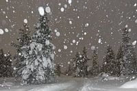 sneeuwstorm in de nacht in lapland Finland december 2019. een wandelpad langs bomen door de natuur.