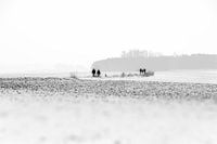 Minimalistisch zwart wit landschapsbeeld van wandelaars in de sneeuw in Bierbeek, België