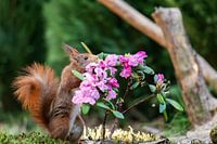 Dit eekhoorntje is lekker in de bloemen aan het snuffelen.
