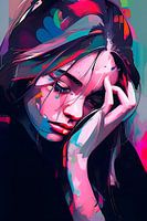 Op het doek zien we een eenzame vrouw, gehuld in paarse en roze tinten. Het gezicht draagt de last van neerslachtigheid, met gebogen schouders en ogen die naar beneden staren. De omgeving weerspiegelt deze somberheid met donker kleuren en een gebrek aan levendigheid. Het schilderij straalt een gevoel van melancholie uit, als een moment van introspectie en reflectie.