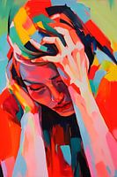 Op het doek zien we een eenzame vrouw, gehuld in rode en roze tinten. Het gezicht draagt de last van neerslachtigheid, met gebogen schouders en ogen die naar beneden staren. De omgeving weerspiegelt deze somberheid met donker kleuren en een gebrek aan levendigheid. Het schilderij straalt een gevoel van melancholie uit, als een moment…