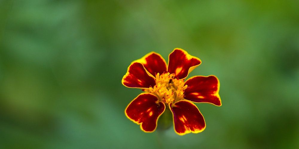 Opname van een enkele studentenbloem, Latijn: Tagetes, met open diafragma om de bloem naar voren te brengen, met een oude lens vanwege het bokeh