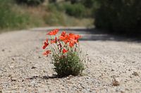 Bosje klaprozen op een landweggetje in Andalusië Spanje. Ongelooflijk dat deze plant het overleefd tussen de steentje en de droogte.