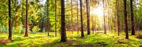 Prachtig groen bos met mos bedekte grond en felle zon die door de bomen schijnt.