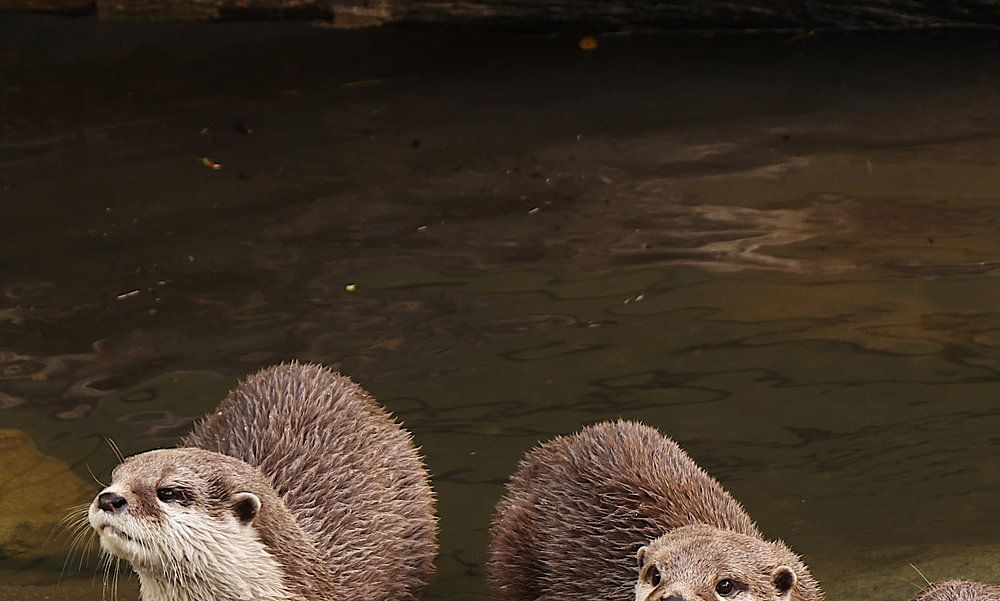Deze foto vangt vier ottertjes in een charmant moment van speelsheid. Eén ottertje staat op zijn achterpootjes, terwijl een ander een open mondje heeft een subtiel detail dat leven en karakter toevoegt. Hun warme bruine vacht met lichte buiktonen geeft een natuurlijk, zacht contrast dat rust en schattigheid uitstraalt. De aandacht voor detail in de houding en gezichtsuitdrukking van de otters zorgt ervoor dat dit beeld een verhaal vertelt, waardoor het meer is dan zomaar een foto: het is een momentopname van de natuurlijke speelsheid van deze fascinerende dieren.