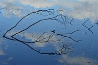 spiegeling van een tak in het water met mooie wolkenlucht.