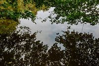 spiegeling van bomen in het water in een meertje in Frankrijk.