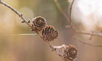 close up van een tak met drie dennenappels, waar een spinnendraad naartoe loopt, en waar het zonlicht van het gouden uur mooi op schijnt