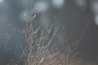 close up van een droge heideplant met een spinnenweb, in het zonlicht van de vroege ochtend
