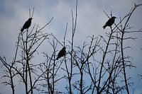 Drie spreeuwen in de toppen van een boom. Gevangen in een mooi silhouet.