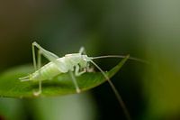 zachte macro van een groene sprinkhaan op een blaadje met een groene achtergrond