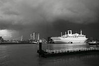 ss Rotterdam, schip van de Holland-Amerika Lijn aan de kade van Katendrecht in zwart-wit. Boven het schip hangt een grote onweersbui. Links op de foto de gebouwen op de Kop van Zuid en de Erasmusbrug.