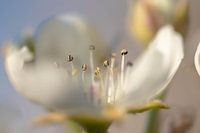 close up van de meeldraden en stampers van de bloesem van een pereboom, met een mooie blauwe lucht op de achtergrond