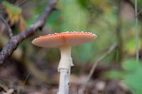 high dynamic range opname van een vliegenzwam in het herfstbos, met een doffe groene achtergrond