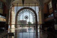 Een modern, nieuw station. Duidelijk is te zien dat de typisch Arabische versieringen terugkomen in een indrukwekkende pui, hier van binnenuit gezien.