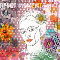Collage met een portret van Frida in line art-stijl voor verschillende texturen en foto's van street art-muren.