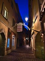 Nachtopname van een smal steegje in Monaco-Ville, het historische centrum van Monaco aan de Middellandse Zee, 's avonds met oude gebouwen, lantaarn en het officiële wapen van de stadstaat.