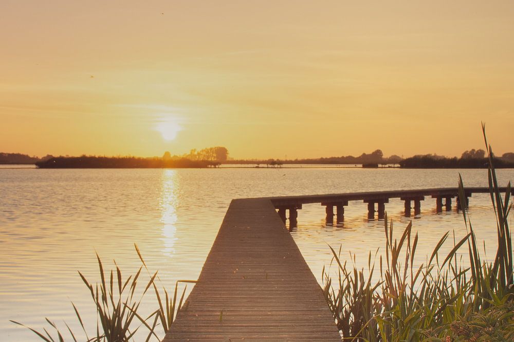 een zonsondergangs foto van het Roegwold. op de voorgrond een stijger met beplanting, In het water is duidelijk de reflectie van de stijger en de zonsondergang te zien.