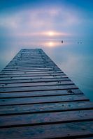 Voetbrug bij het meer met mist in de zonsopgang