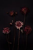 Donkere compositie van vergane bloemen met rode tinten. Bloemenkunst.
