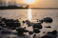 close up van stenen aan de oever van de Rijn in Opheusden, Gelderland, met op de achtergrond de ondergaande zon