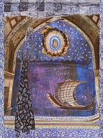 staande collage in donkerblauwe en paarse tinten een hoge poort met uitzicht op zee en sterrenhemel links vooraan een vrouwenfiguur met de armen omhoog op zee een zeilschip van mozaïek in de lucht een groot stralend hemellichaam (doorsnede van een geode)
