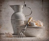 Stilleven ton-sur-ton met schenkkan,schelpen,schaal en vork.