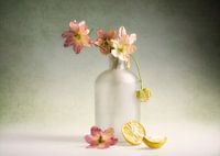 Stilleven met fles, bloemen en citroen.