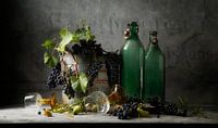 Stilleven met druiven, flessen en glazen.
