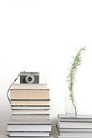 een stilleven van boeken, oude camera, een vaas met een takje rozemarijn