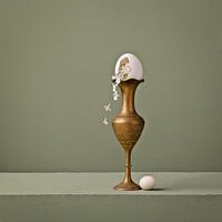 Stilleven met vallende bloemen uit een kapot ei.