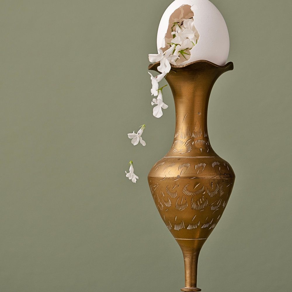 Stilleven met vallende bloemen uit een kapot ei.