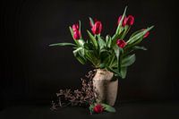 Stilleven met bos rode tulpen en een bloesemtak van het krentenboompje. Het boeket staat in een vaas van keramiek. Een beetje kleur aan de wand en het voorjaar in huis.