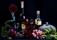 rode en rood/witte dahlia’s, drankflessen, een vaas en een pot vormen met glazen van maastrichts glaswerk een mooi stilleven tegen een donkerblauwe fluwelen achtergrond, een mooi belichting maakt het tafereeltje af